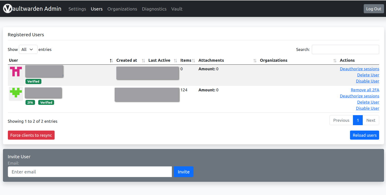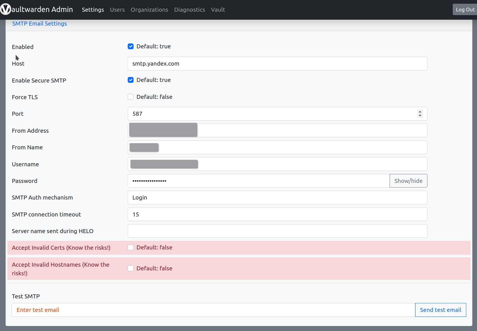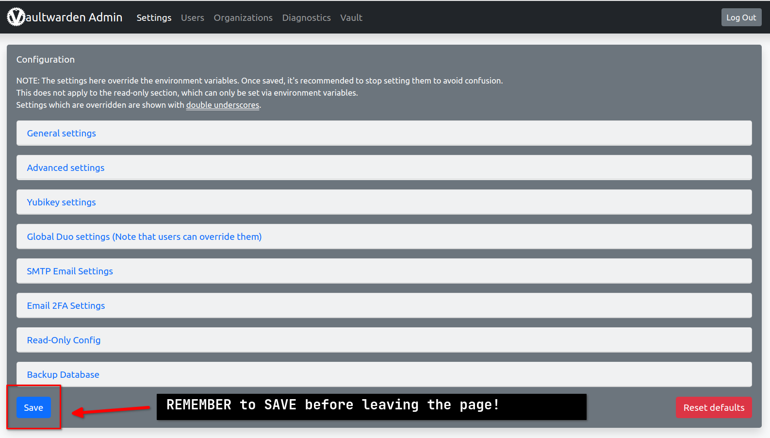 Go to https://bitwarden.example.com/admin and log in with the ADMIN_TOKEN you previously set.