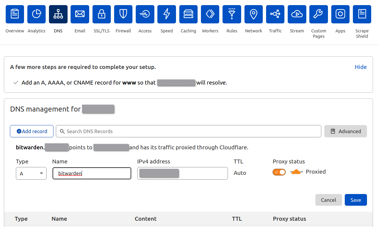 Remember to switch on the “Proxy”. Cloudflare will help you hide origin IP, handle threats and accelerate loading.