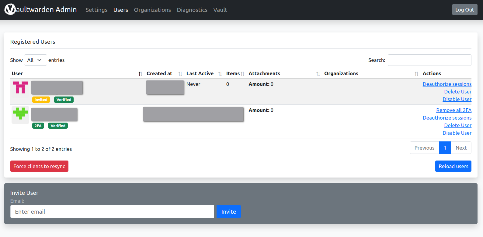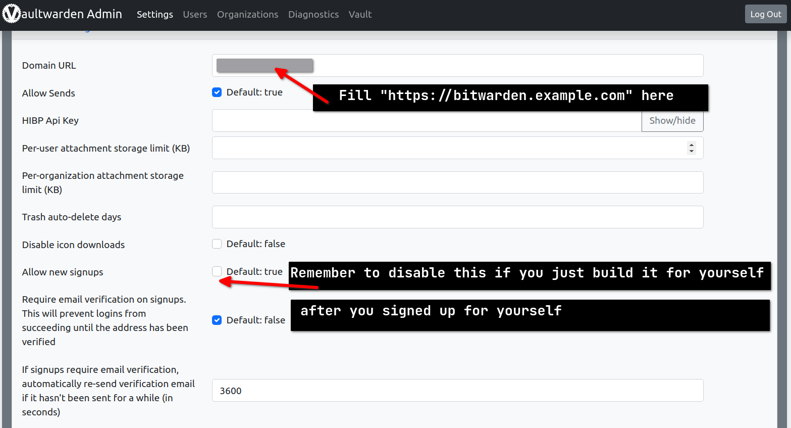 Go to https://bitwarden.example.com/admin and log in with the ADMIN_TOKEN you previously set.