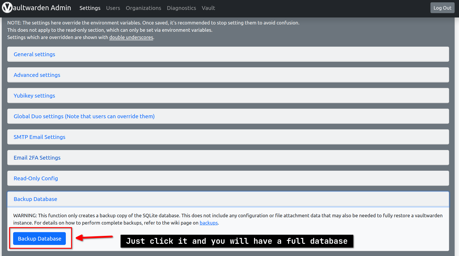 You can do this via command line too. Referencesqlite3 ./vw-data/db.sqlite3 "VACUUM INTO './vw-data/db_$(date '+%Y%m%d-%H%M').sqlite3'"