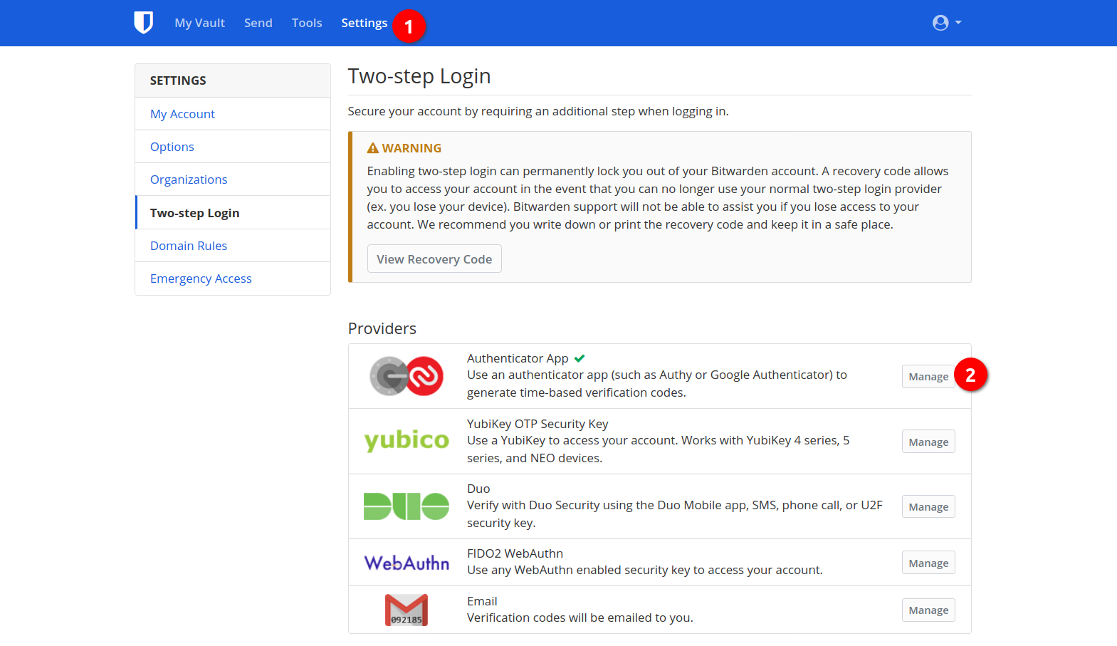 Then go to Settings -> Two-step Login and setup Authenticator App for 2FA. Based on TOTP, it supports a lot of authenticator apps. There are some good applications and it is NOT recommended to use Authy.